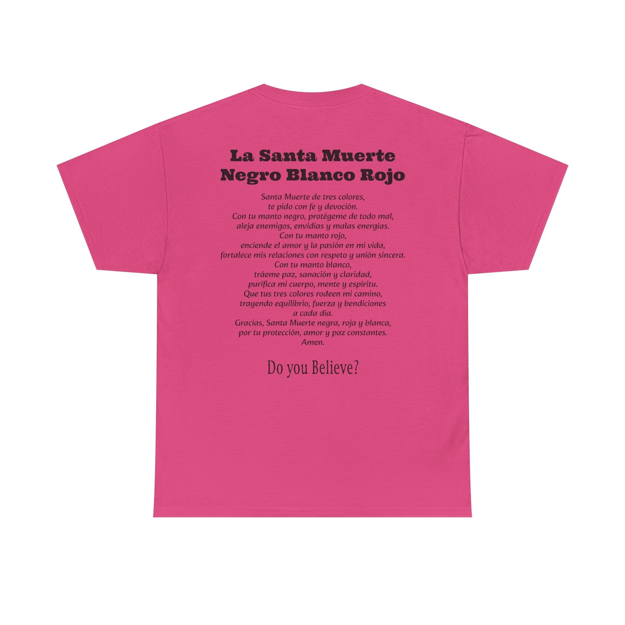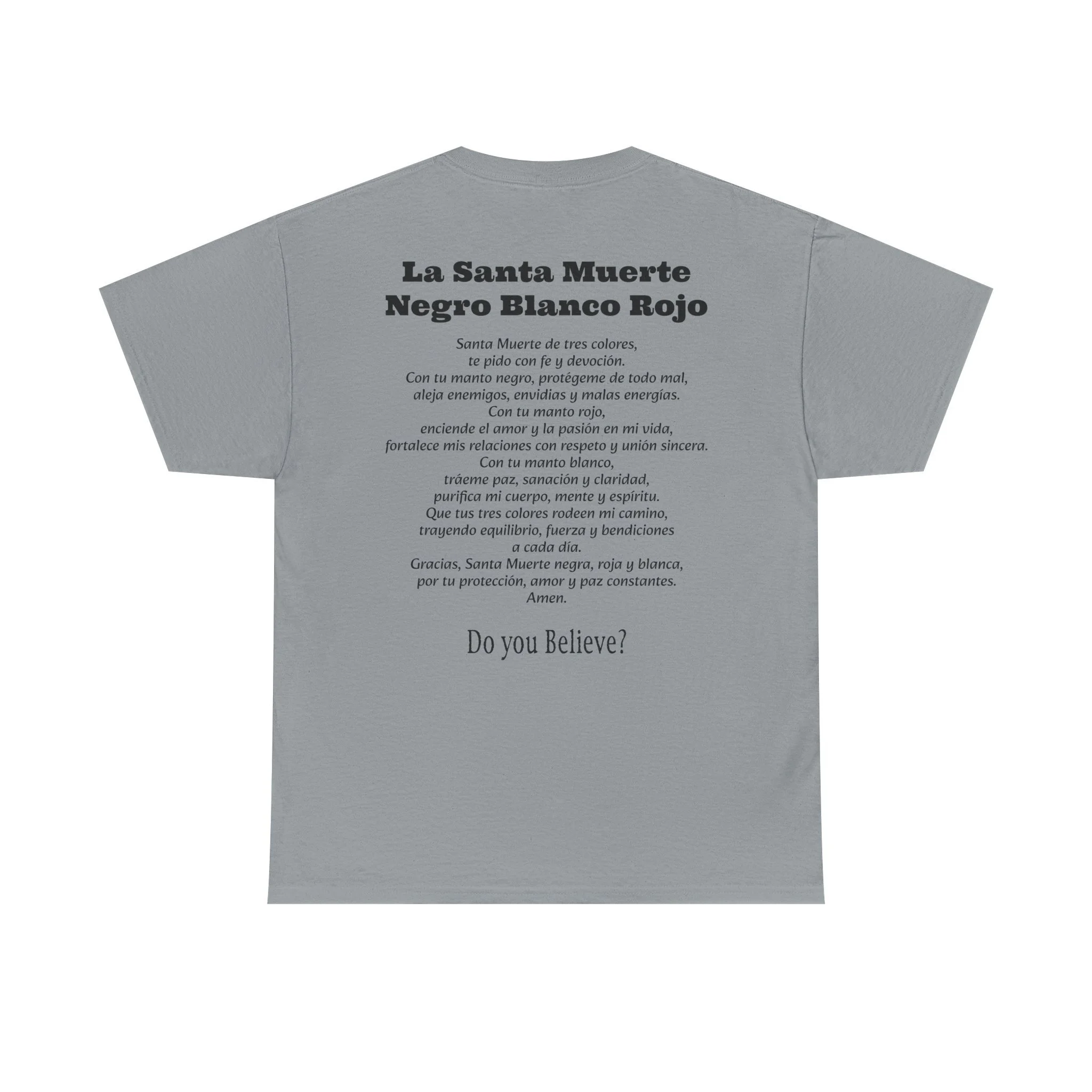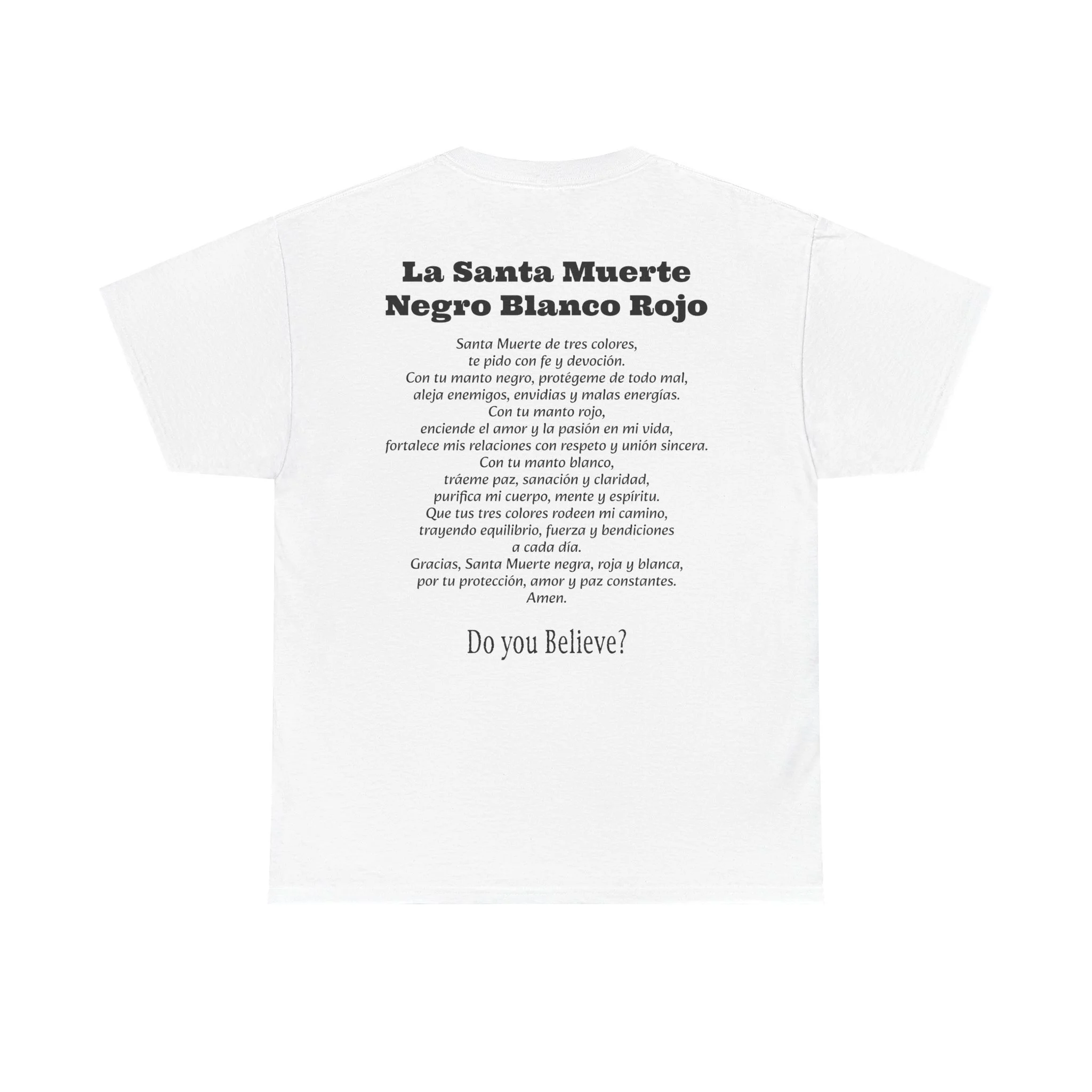 Cada playera presenta la imagen sagrada de La Santa Muerte en el frente en sus diferentes colores, y en la parte de atrás su poderosa oración según el color: