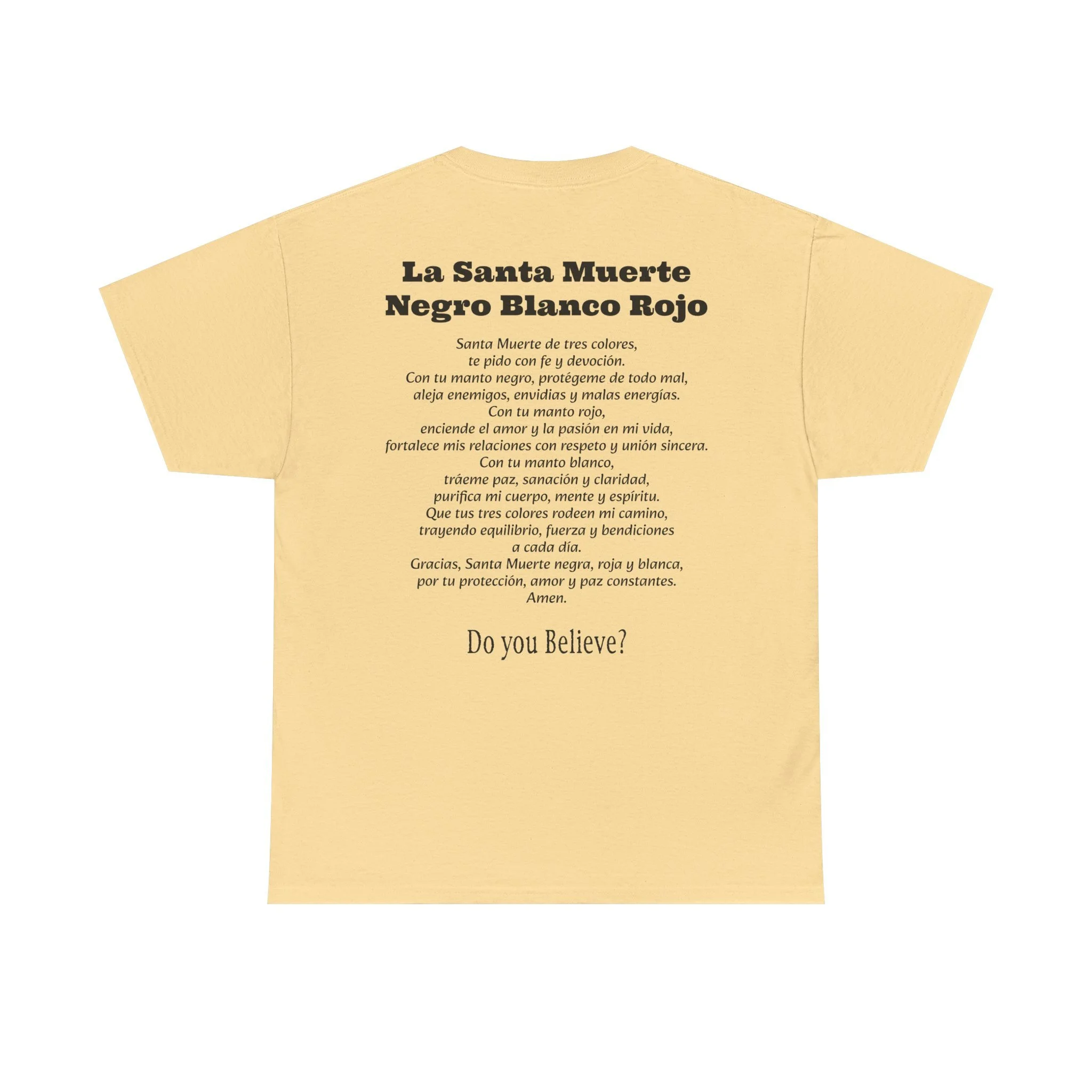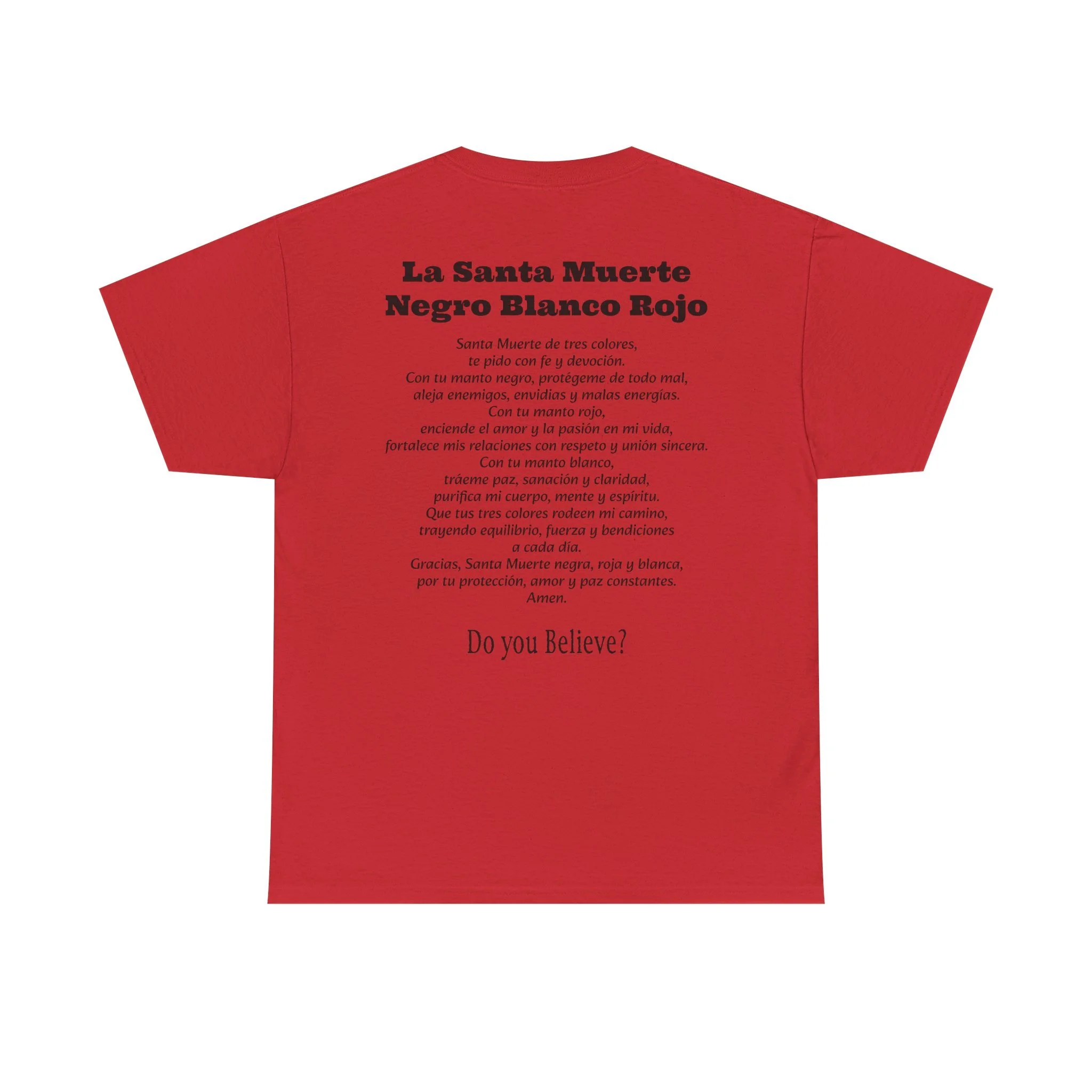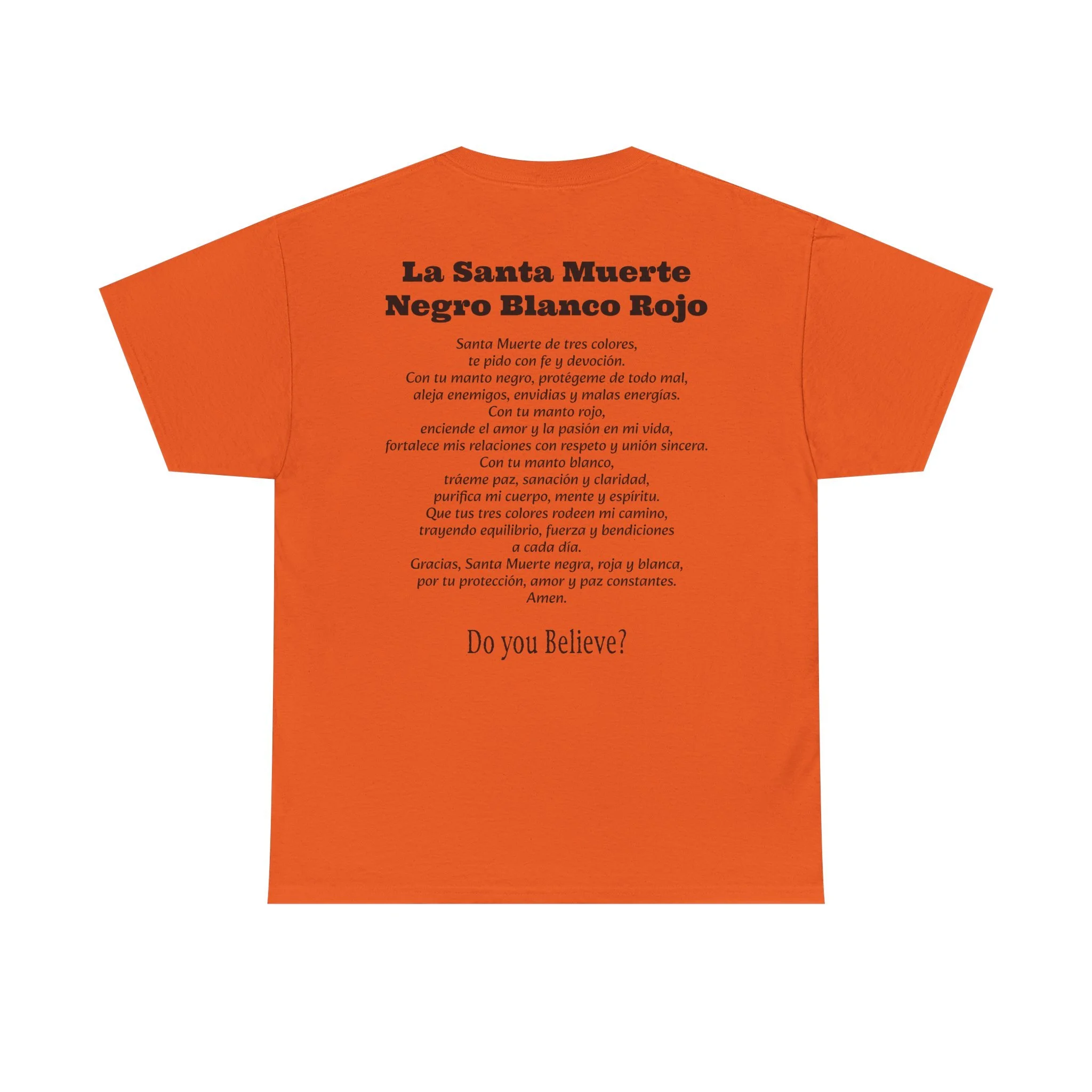 Cada playera presenta la imagen sagrada de La Santa Muerte en el frente en sus diferentes colores, y en la parte de atrás su poderosa oración según el color: