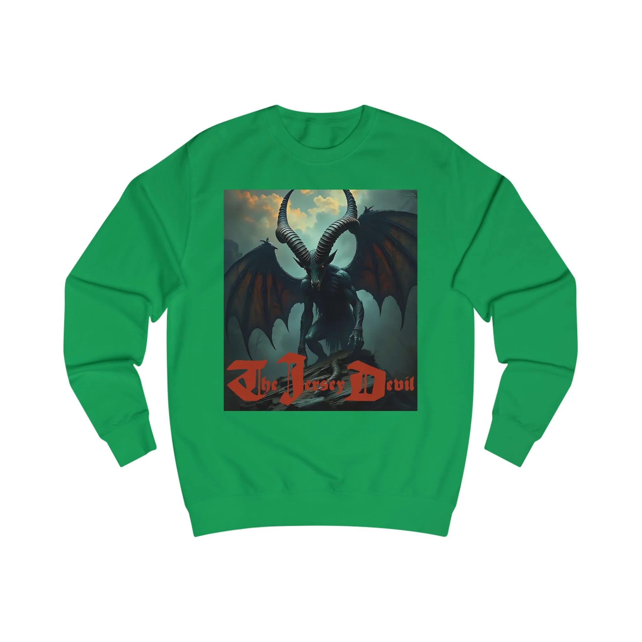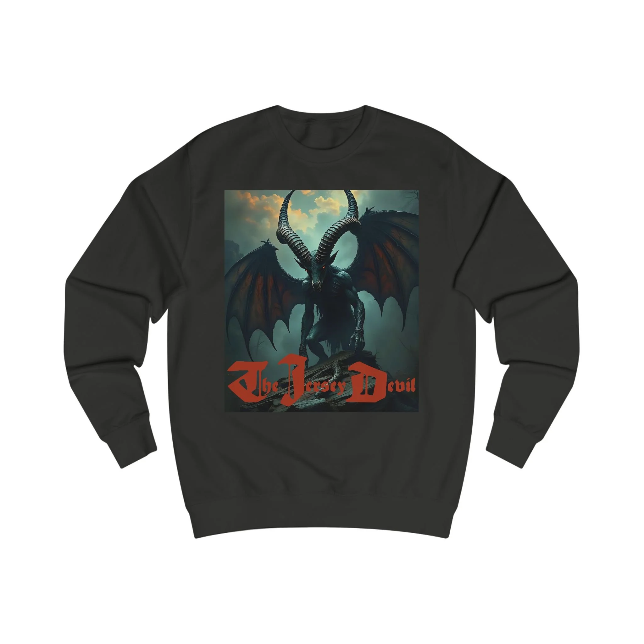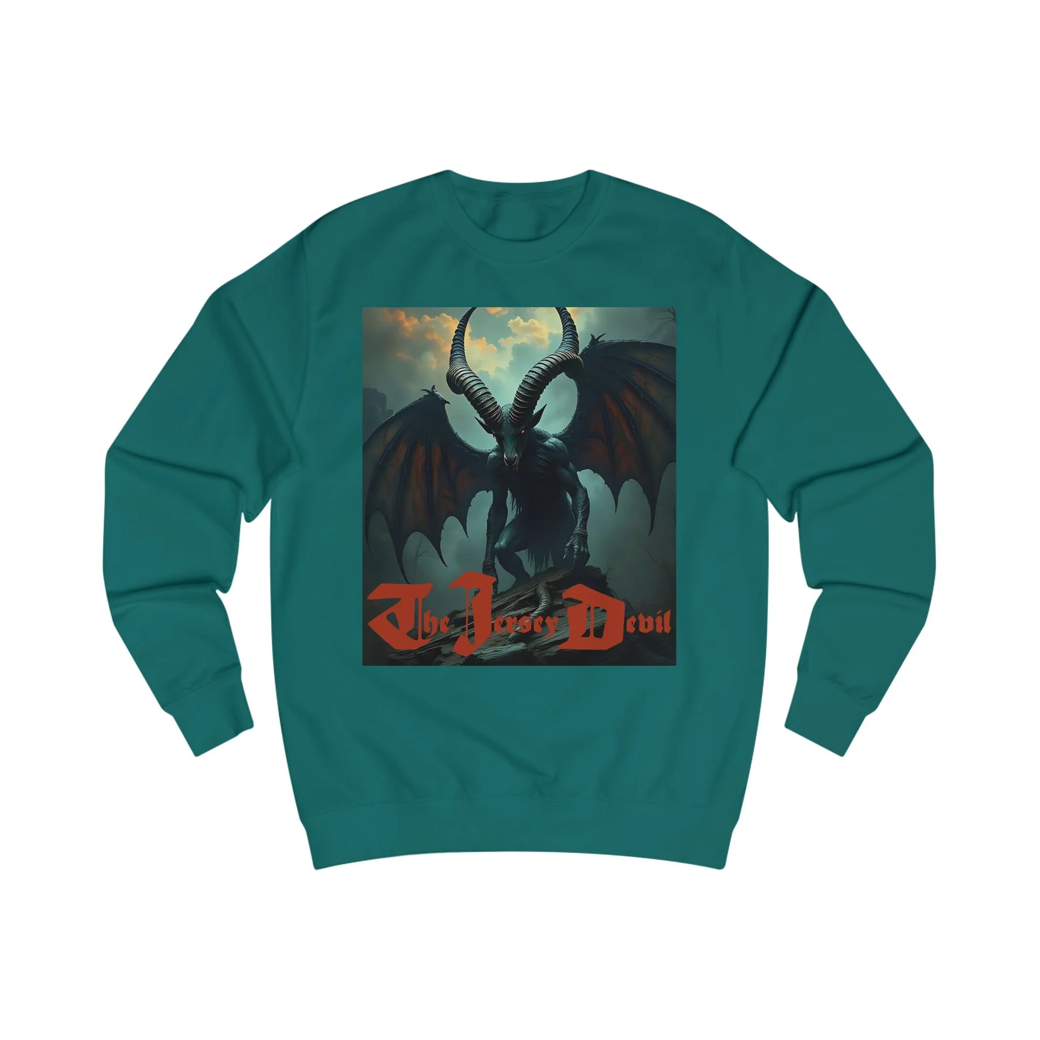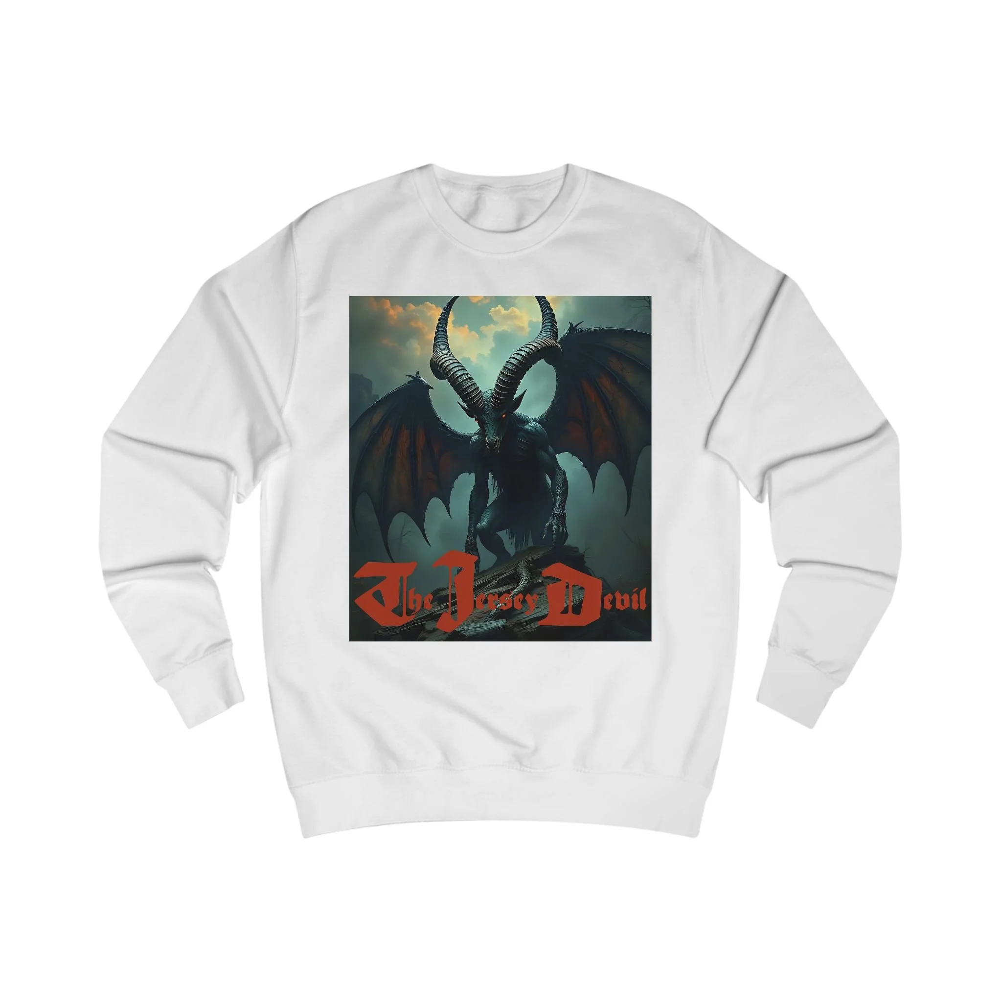 This sweatshirt is a work of artistic storytelling and cultural folklore. It is not intended as proof of the Jersey Devil’s existence.