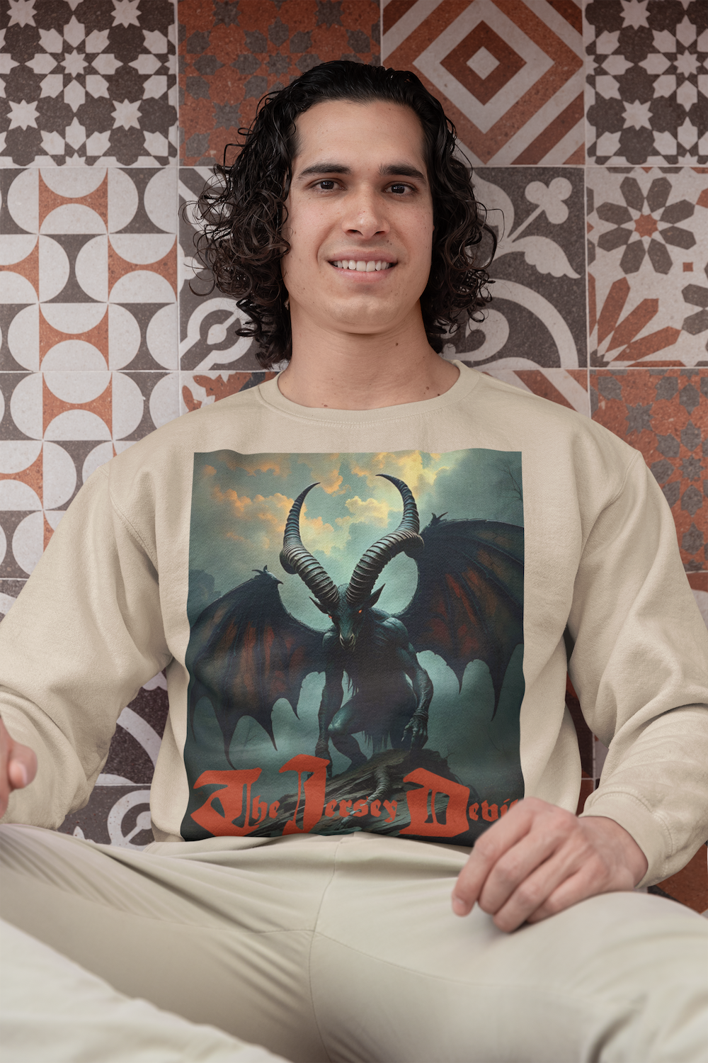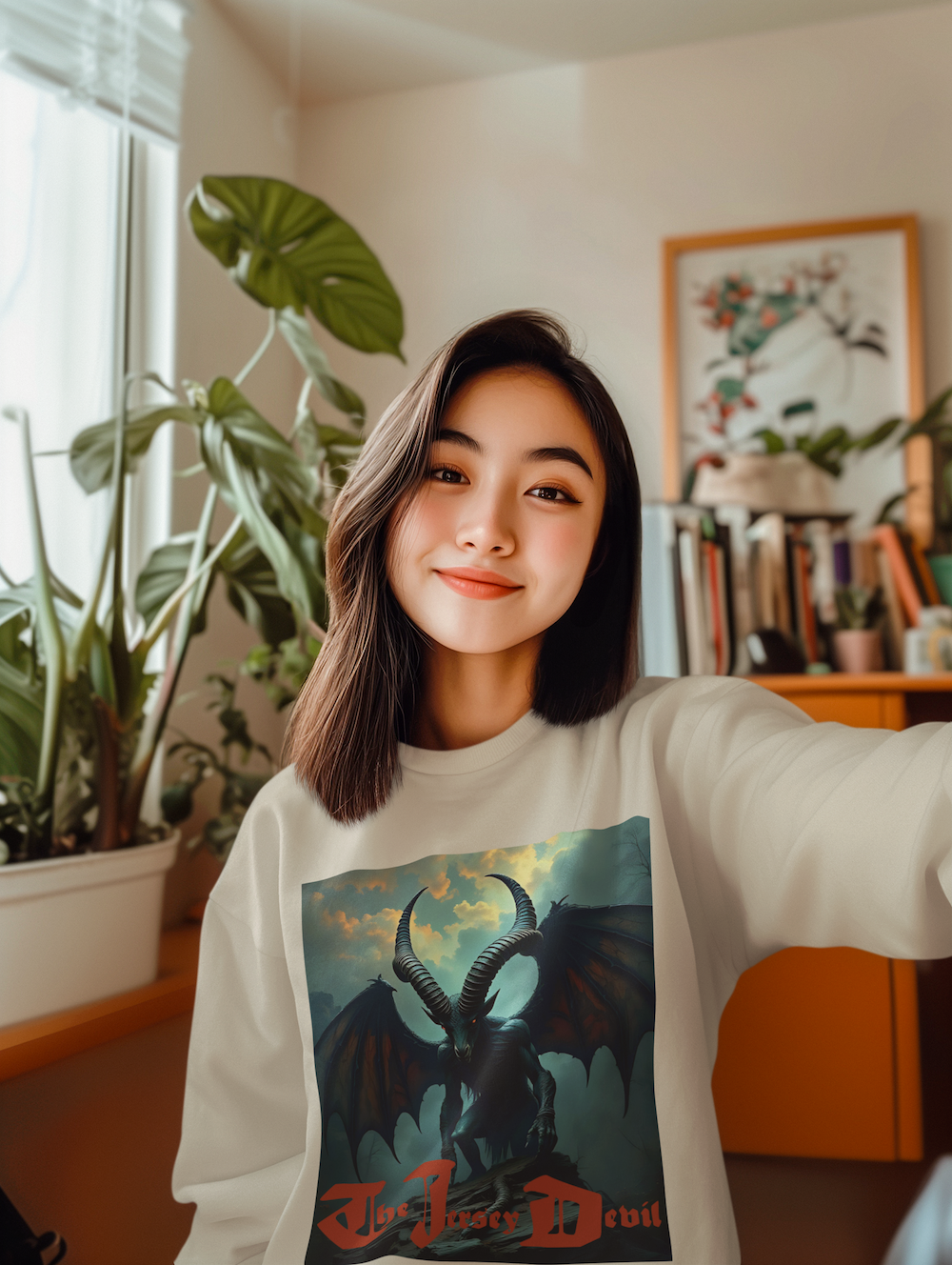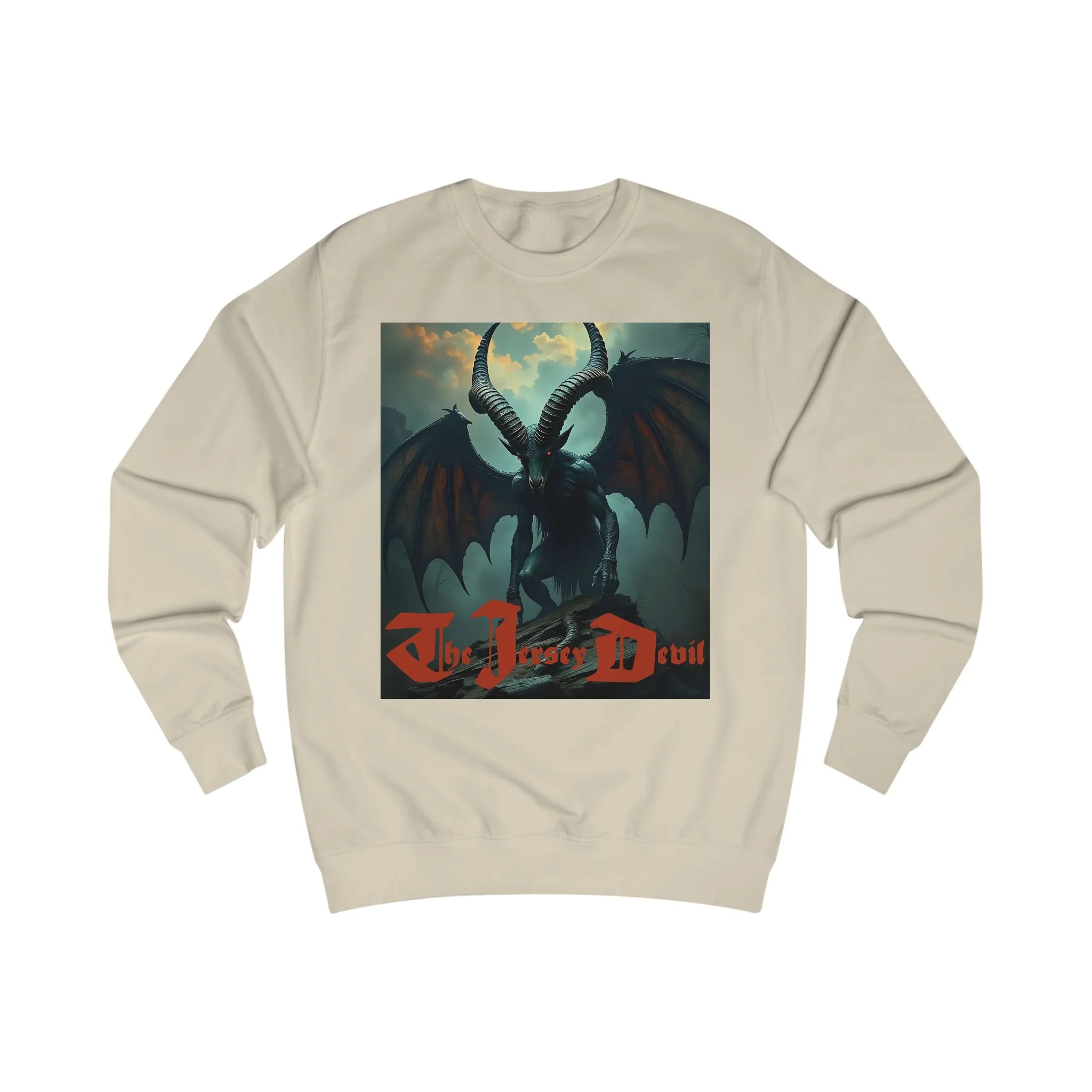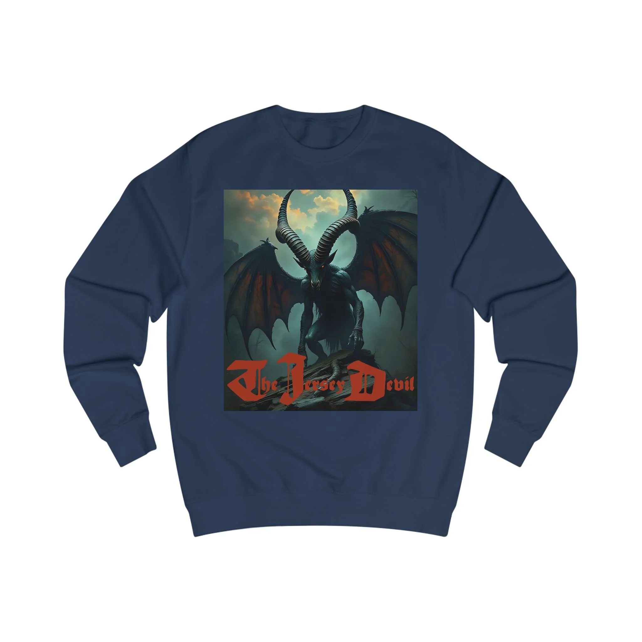 This sweatshirt is a work of artistic storytelling and cultural folklore. It is not intended as proof of the Jersey Devil’s existence.